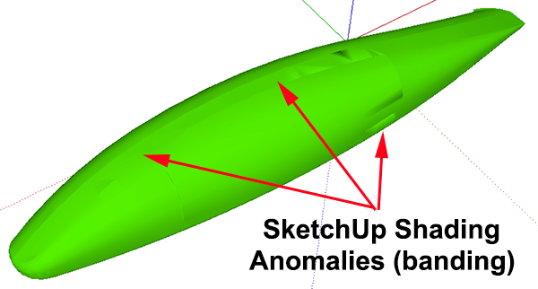 1. SketchUp has no ability to import any vertex normals from another file format. This is a problematic shortcoming. Vertex normals define the smoothness of an object and as such they are critically needed when importing from CAD files. SketchUp uses "edge lists" and "edge smoothing flags" to decide whether two adjacent polygons should appear smoothed in the SketchUp user interface. While this concept was ideal for simple, hand-sketched architectural models, it can often fail when handling CAD models which contain a mixture of abrupt and smooth edges all in the same model. Thus, special care must be taken when trying to import CAD files into SketchUp so that "black banding" shading artifacts and rogue edges do not show up. There is no "one size fits all" solution to overcome this lack of vertex normals in SketchUp.