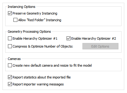 These options provide methods to remove redundant hierarchy nodes (“NULLs”, or grouping folders) from the imported file. Optimizer #1 removes runs of empty folders, as well as folders with no children. Optimizer #2 is simpler, deleting empty folders which only have 1 geometry object in them. These options can also be enabled via the “Optimize hierarchy after completion” checkbox found on the options dialog box of the “Compress & optimize number of objects” option (see below).Compress & optimize number of objects