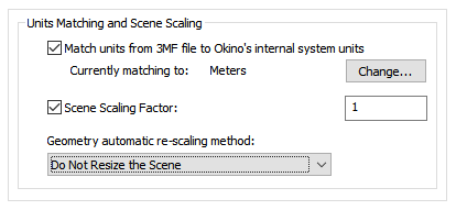 If this checkbox is enabled then the importer will rescale all imported geometry so that the units of the 3MF file will be made to match the current Okino internal system units. If the checkbox is disabled then the geometry will be imported unchanged and untouched, meaning that its scale may be "incorrect".