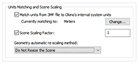 These options determine what will be done when the units defined in the current 3MF scene do not match those of the destination Okino “internal system units” (which is listed on the dialog box as the “Current matching to” units).If the units do not match then the importer will rescale the imported geometry based on the ratio between the 3MF units and the current Okino internal system units (the “Current matching to” units).