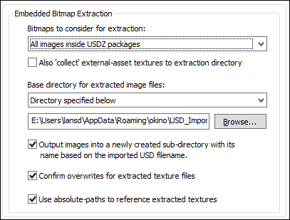 USD files allow for embedded texture map bitmap images within USDZ packages. This combo box provides control over which of those embedded images will be extracted to disk based files.All Images Inside USDZ Packages